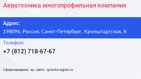 Акватехника, многопрофильная компания по адресу 198096, Россия, Санкт-Петербург, Кронштадтская, 8 в дальнейшем Организация, размещена в следующих категориях: