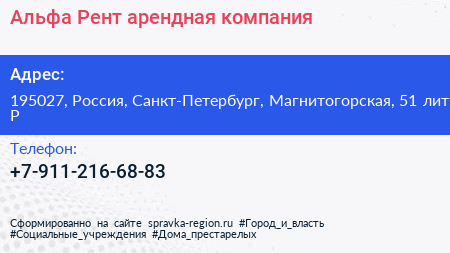 Альфа-Рент, арендная компания по адресу 195027, Россия, Санкт-Петербург, Магнитогорская, 51 лит Р в дальнейшем Организация, размещена в следующих категориях: