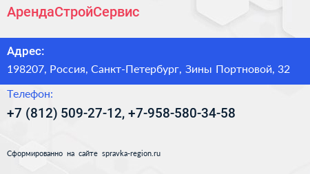 АрендаСтройСервис по адресу 198207, Россия, Санкт-Петербург, Зины Портновой, 32 в дальнейшем Организация, размещена в следующих категориях: