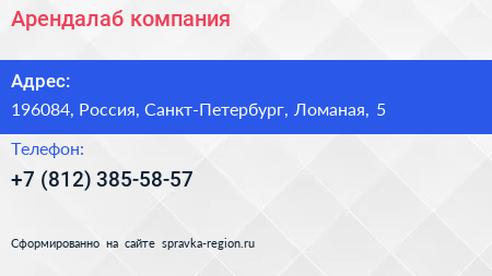 Арендалаб, компания по адресу 196084, Россия, Санкт-Петербург, Ломаная, 5 в дальнейшем Организация, размещена в следующих категориях: