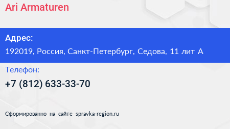 Ari-Armaturen по адресу 192019, Россия, Санкт-Петербург, Седова, 11 лит А в дальнейшем Организация, размещена в следующих категориях: