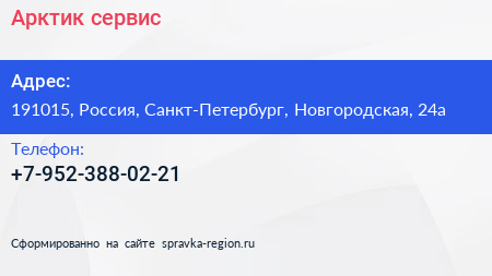 Арктик-сервис по адресу 191015, Россия, Санкт-Петербург, Новгородская, 24а в дальнейшем Организация, размещена в следующих категориях:
