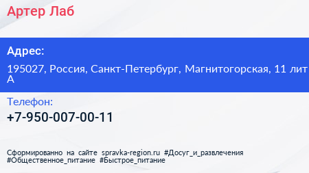 Артер-Лаб по адресу 195027, Россия, Санкт-Петербург, Магнитогорская, 11 лит А в дальнейшем Организация, размещена в следующих категориях: