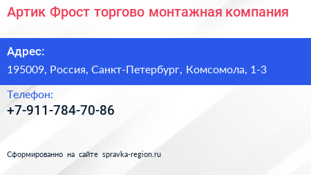 Артик Фрост, торгово-монтажная компания по адресу 195009, Россия, Санкт-Петербург, Комсомола, 1-3 в дальнейшем Организация, размещена в следующих категориях: