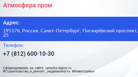 Атмосфера пром по адресу 195176, Россия, Санкт-Петербург, Пискарёвский проспект, 25 в дальнейшем Организация, размещена в следующих категориях: