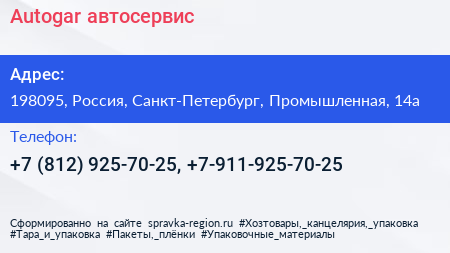 Autogar, автосервис по адресу 198095, Россия, Санкт-Петербург, Промышленная, 14а в дальнейшем Организация, размещена в следующих категориях: