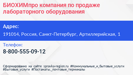 БИОХИМпро, компания по продаже лабораторного оборудования по адресу 191014, Россия, Санкт-Петербург, Артиллерийская, 1 в дальнейшем Организация, размещена в следующих категориях:
