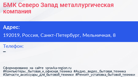 БМК Северо-Запад, металлургическая компания по адресу 192019, Россия, Санкт-Петербург, Мельничная, 8 в дальнейшем Организация, размещена в следующих категориях: