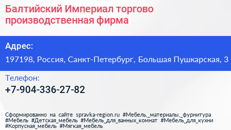 Балтийский Империал, торгово-производственная фирма по адресу 197198, Россия, Санкт-Петербург, Большая Пушкарская, 3 в дальнейшем Организация, размещена в следующих категориях: