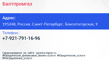 Балтпромгаз по адресу 195248, Россия, Санкт-Петербург, Бокситогорская, 9 в дальнейшем Организация, размещена в следующих категориях: