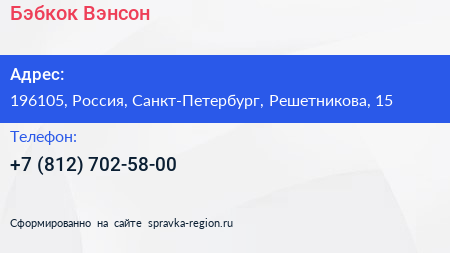 Бэбкок Вэнсон по адресу 196105, Россия, Санкт-Петербург, Решетникова, 15 в дальнейшем Организация, размещена в следующих категориях: