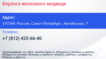 Берлога железного медведя по адресу 197349, Россия, Санкт-Петербург, Автобусная, 7 в дальнейшем Организация, размещена в следующих категориях: