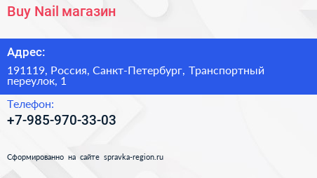 Buy-Nail, магазин по адресу 191119, Россия, Санкт-Петербург, Транспортный переулок, 1 в дальнейшем Организация, размещена в следующих категориях: