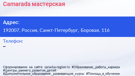 Camarada, мастерская по адресу 192007, Россия, Санкт-Петербург, Боровая, 116 в дальнейшем Организация, размещена в следующих категориях: