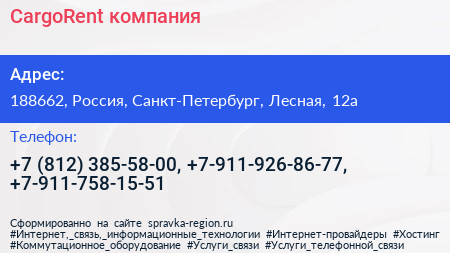 CargoRent, компания по адресу 188662, Россия, Санкт-Петербург, Лесная, 12а в дальнейшем Организация, размещена в следующих категориях:
