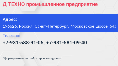 Д-ТЕХНО, промышленное предприятие по адресу 196626, Россия, Санкт-Петербург, Московское шоссе, 64а в дальнейшем Организация, размещена в следующих категориях: