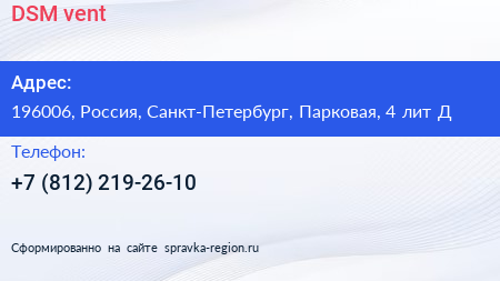 DSM-vent по адресу 196006, Россия, Санкт-Петербург, Парковая, 4 лит Д в дальнейшем Организация, размещена в следующих категориях: