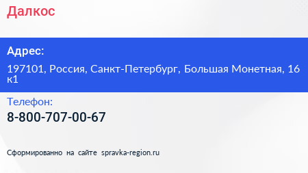 Далкос по адресу 197101, Россия, Санкт-Петербург, Большая Монетная, 16 к1 в дальнейшем Организация, размещена в следующих категориях: