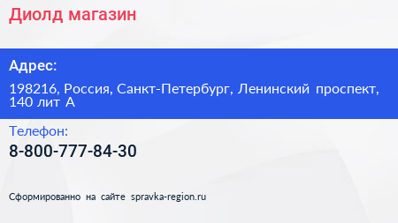 Диолд, магазин по адресу 198216, Россия, Санкт-Петербург, Ленинский проспект, 140 лит А в дальнейшем Организация, размещена в следующих категориях: