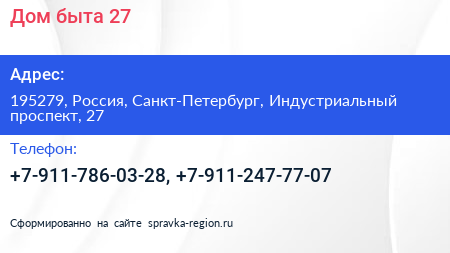 Дом быта №27 по адресу 195279, Россия, Санкт-Петербург, Индустриальный проспект, 27 в дальнейшем Организация, размещена в следующих категориях: