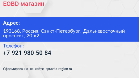 EOBD, магазин по адресу 193168, Россия, Санкт-Петербург, Дальневосточный проспект, 20 к2 в дальнейшем Организация, размещена в следующих категориях: