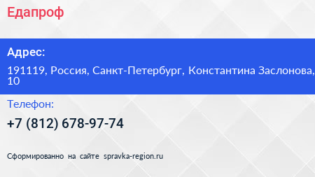 Едапроф по адресу 191119, Россия, Санкт-Петербург, Константина Заслонова, 10 в дальнейшем Организация, размещена в следующих категориях: