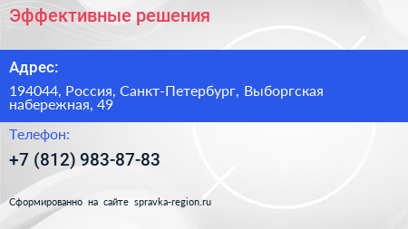 Эффективные решения по адресу 194044, Россия, Санкт-Петербург, Выборгская набережная, 49 в дальнейшем Организация, размещена в следующих категориях: