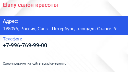 Elany, салон красоты по адресу 198095, Россия, Санкт-Петербург, площадь Стачек, 9 в дальнейшем Организация, размещена в следующих категориях: