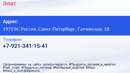 Элат по адресу 197136, Россия, Санкт-Петербург, Гатчинская, 18 в дальнейшем Организация, размещена в следующих категориях:
