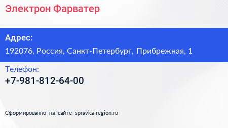 Электрон-Фарватер по адресу 192076, Россия, Санкт-Петербург, Прибрежная, 1 в дальнейшем Организация, размещена в следующих категориях: