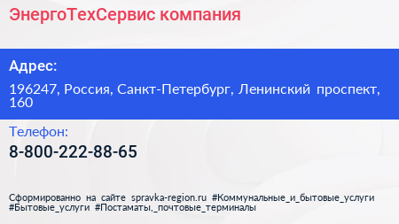 ЭнергоТехСервис, компания по адресу 196247, Россия, Санкт-Петербург, Ленинский проспект, 160 в дальнейшем Организация, размещена в следующих категориях:
