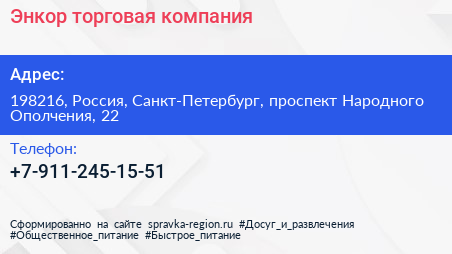 Энкор, торговая компания по адресу 198216, Россия, Санкт-Петербург, проспект Народного Ополчения, 22 в дальнейшем Организация, размещена в следующих категориях:
