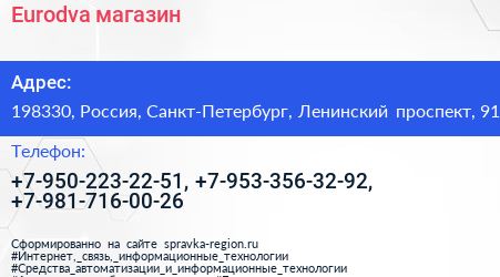 Eurodva, магазин по адресу 198330, Россия, Санкт-Петербург, Ленинский проспект, 91 в дальнейшем Организация, размещена в следующих категориях: