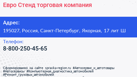 Евро Стенд, торговая компания по адресу 195027, Россия, Санкт-Петербург, Якорная, 17 лит Ш в дальнейшем Организация, размещена в следующих категориях: