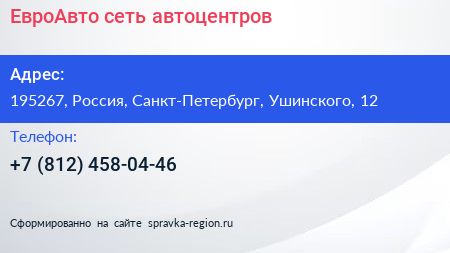 ЕвроАвто, сеть автоцентров по адресу 195267, Россия, Санкт-Петербург, Ушинского, 12 в дальнейшем Организация, размещена в следующих категориях: