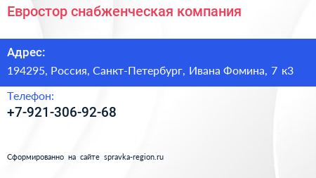 Евростор, снабженческая компания по адресу 194295, Россия, Санкт-Петербург, Ивана Фомина, 7 к3 в дальнейшем Организация, размещена в следующих категориях: