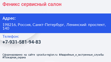 Феникс, сервисный салон по адресу 198216, Россия, Санкт-Петербург, Ленинский проспект, 140 в дальнейшем Организация, размещена в следующих категориях: