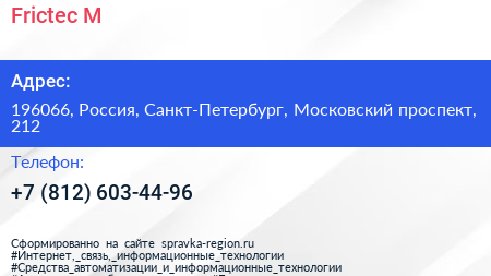 Frictec M по адресу 196066, Россия, Санкт-Петербург, Московский проспект, 212 в дальнейшем Организация, размещена в следующих категориях: