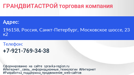 ГРАНДВИТАСТРОЙ, торговая компания по адресу 196158, Россия, Санкт-Петербург, Московское шоссе, 23 к2 в дальнейшем Организация, размещена в следующих категориях: