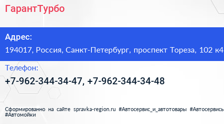 ГарантТурбо по адресу 194017, Россия, Санкт-Петербург, проспект Тореза, 102 к4 в дальнейшем Организация, размещена в следующих категориях: