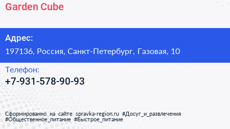 Garden Cube по адресу 197136, Россия, Санкт-Петербург, Газовая, 10 в дальнейшем Организация, размещена в следующих категориях:
