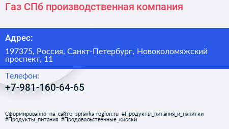 Газ-СПб, производственная компания по адресу 197375, Россия, Санкт-Петербург, Новоколомяжский проспект, 11 в дальнейшем Организация, размещена в следующих категориях: