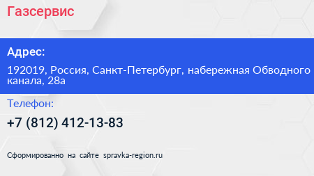Газсервис+ по адресу 192019, Россия, Санкт-Петербург, набережная Обводного канала, 28а в дальнейшем Организация, размещена в следующих категориях:
