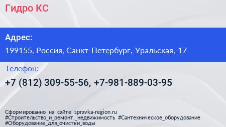 Гидро-КС по адресу 199155, Россия, Санкт-Петербург, Уральская, 17 в дальнейшем Организация, размещена в следующих категориях: