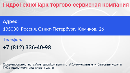 ГидроТехноПарк, торгово-сервисная компания по адресу 195030, Россия, Санкт-Петербург, Химиков, 26 в дальнейшем Организация, размещена в следующих категориях: