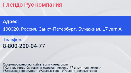 Глендо-Рус, компания по адресу 190020, Россия, Санкт-Петербург, Бумажная, 17 лит А в дальнейшем Организация, размещена в следующих категориях: