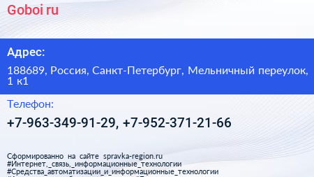 Goboi.ru по адресу 188689, Россия, Санкт-Петербург, Мельничный переулок, 1 к1 в дальнейшем Организация, размещена в следующих категориях: