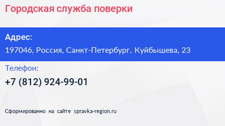 Городская служба поверки по адресу 197046, Россия, Санкт-Петербург, Куйбышева, 23 в дальнейшем Организация, размещена в следующих категориях: