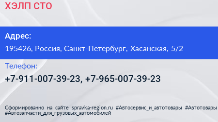 ХЭЛП СТО по адресу 195426, Россия, Санкт-Петербург, Хасанская, 5/2 в дальнейшем Организация, размещена в следующих категориях: