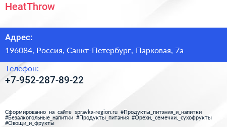 HeatThrow по адресу 196084, Россия, Санкт-Петербург, Парковая, 7а в дальнейшем Организация, размещена в следующих категориях: